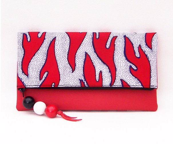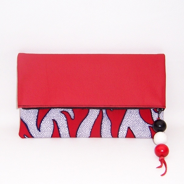 RUBI rode leren clutch met batik stof en houten kralen