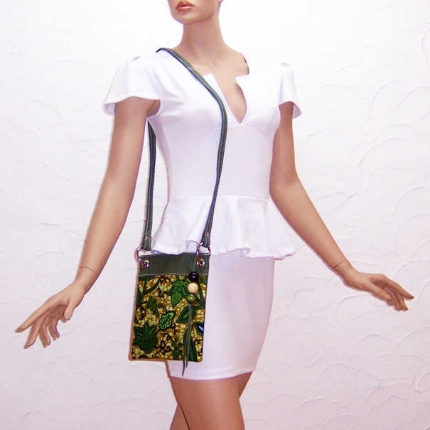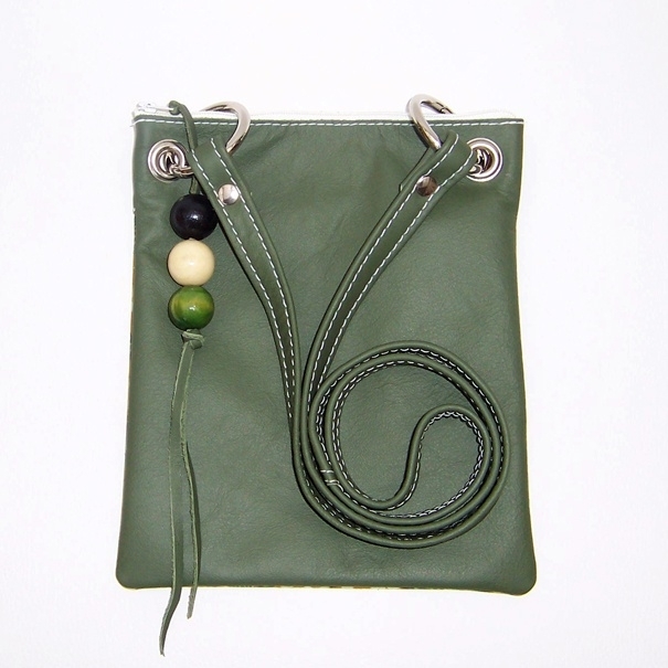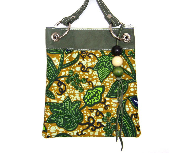 BISA schoudertasje van donker-groen leer met batik stof en kralen